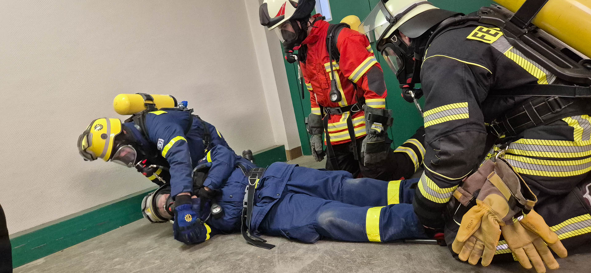 Unter Atemschutz tragen die Einsatzkräfte zusätzlich zur normalen Schutzkleidung ein ca. 16 Kilogramm schweres Gerät auf dem Rücken. In völliger Dunkelheit, bei starker Hitze und null Sicht müssen sie Brände bekämpfen, vermisste Personen suchen und retten sowie sich jederzeit auf ihren Trupppartner verlassen können. Höchste Konzentration, gegenseitiges Vertrauen und körperliche Belastbarkeit sind hier entscheidend.