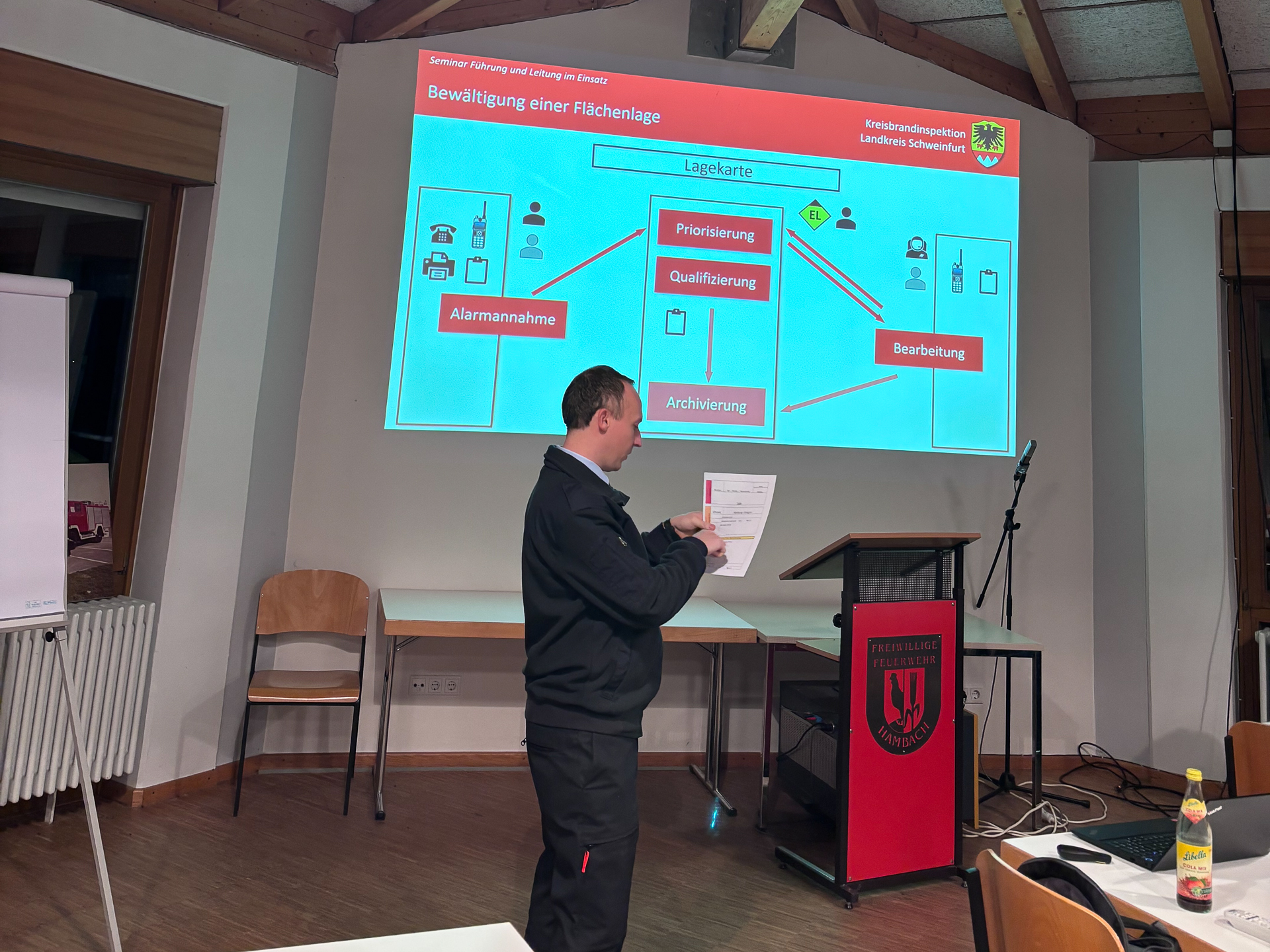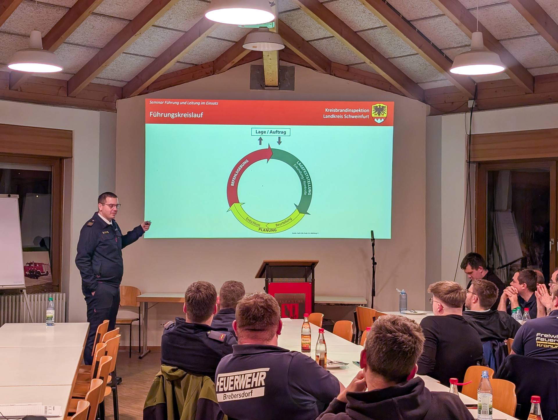 Am Dienstag, 02.12.2025, sowie Donnerstag, 04.12.2025 fand nach einem Pilotseminar im Jahr 2024 das erste planmäßige Seminar “Führen und Leiten im Einsatzdienst” statt. Dieses Seminar bildet den Gegenpart zum etablierten und seit 2023 durchgeführten Seminar Führungsunterstützung und ist für Kommandanten, sowie Gruppen- und Zugführer der Feuerwehren gedacht, die als Einsatzleiter tätig werden und somit die Führungsunterstützung erhalten sollen.