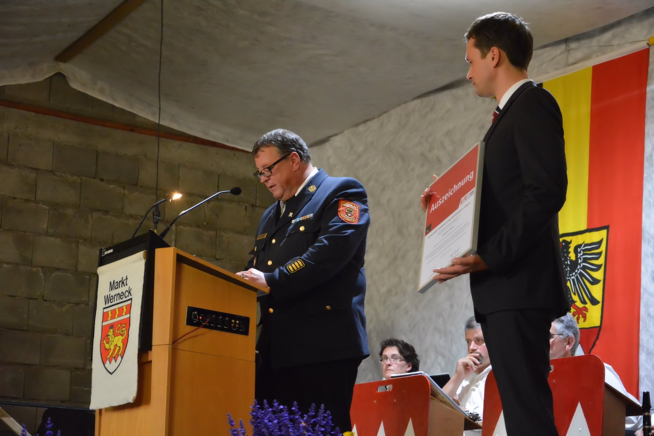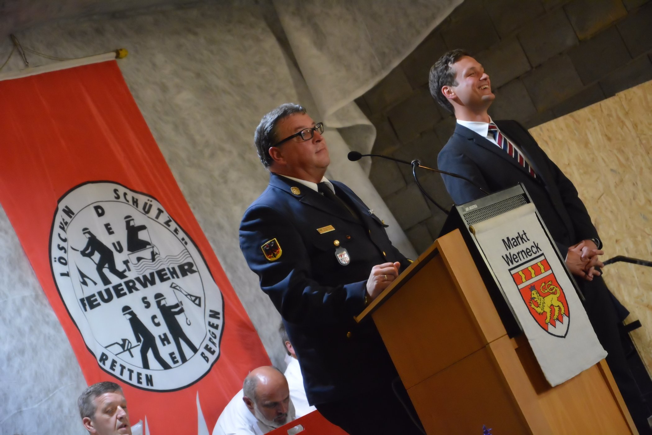 Des Weiteren wurden zwei Firmen aus der Markt Werneck mit der Urkunde „Partner der Feuerwehr“ vom Landesfeuerwehrverband Bayern geehrt. Die Firma Stumpf hat unter anderem die Planung, Herstellung und den Einbau des Wandschrankes im Schulungsraum des Feuerwehrhauses vorgenommen. Dankbar dürften wir uns an Adolf Stumpf wenden und um Rat fragen, wenn Vorschläge oder handwerklicher Unterstützung benötigt werden. Nicht zu vergessen ist, dass die Firma Stumpf jederzeit Verständnis hat, wenn in der Schreinerei beschäftigte Mitarbeiter zu einem Einsatz gerufen werden. Es ist nicht selbstverständlich, dass die Mitarbeiter für diese ehrenamtliche Tätigkeit freigestellt werden betonte Kreisbrandrat Holger Strunk.