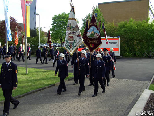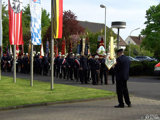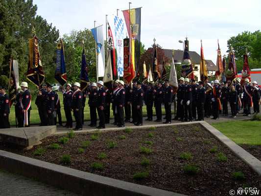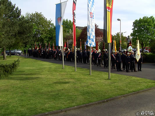 BERGRHEINFELD (hof) Großer Bahnhof vor der Kirche Sankt Bartholomäus: Rund 500 Feuerwehrleute mit 29 Fahnenabordnungen erwarten Bischof Friedhelm Hofmann zum traditionellen Floriangottesdienst.