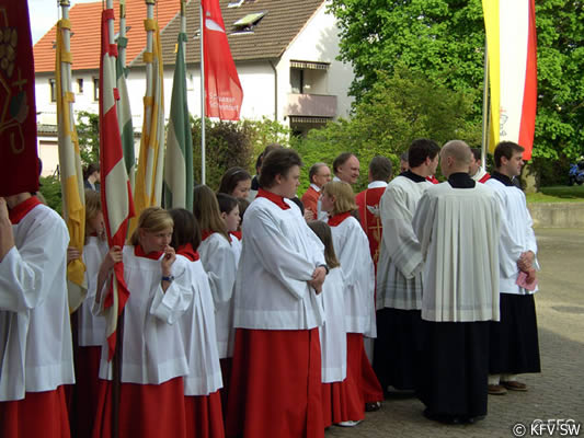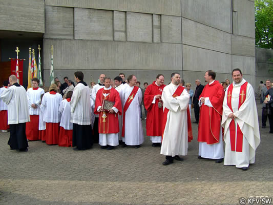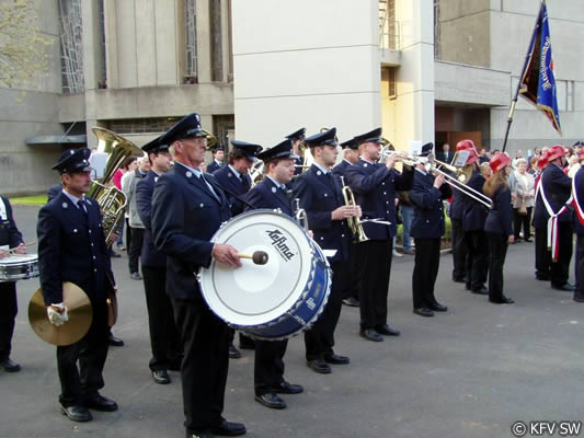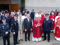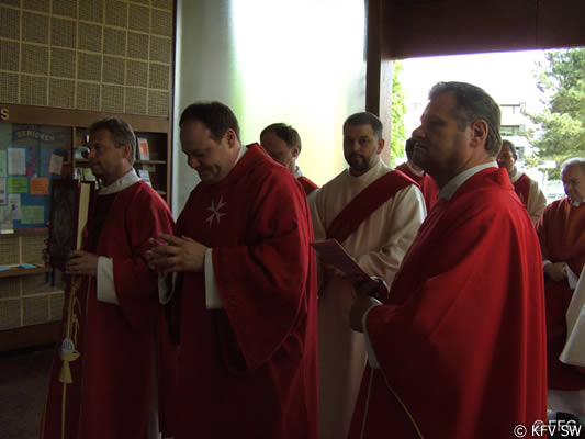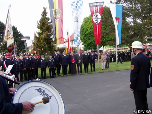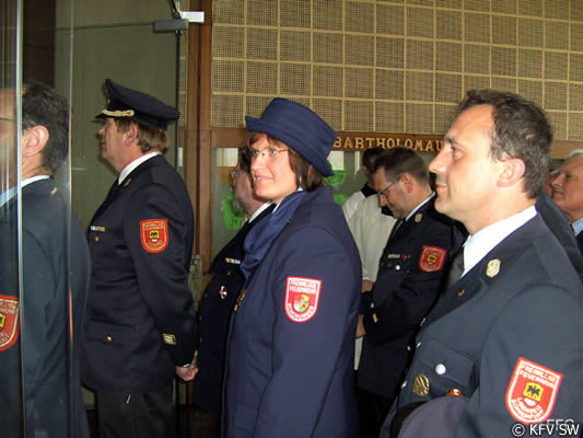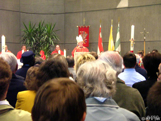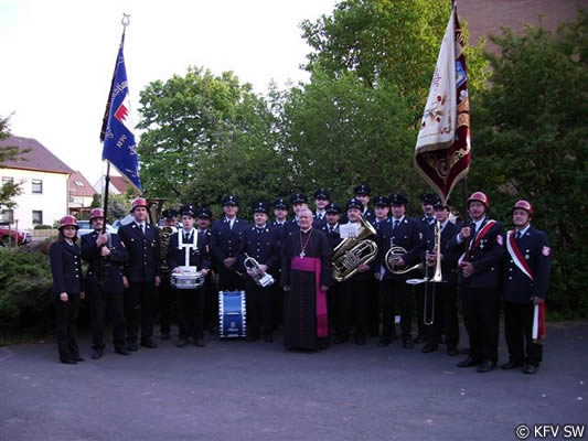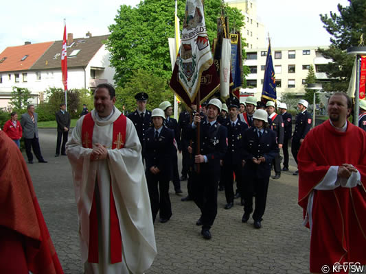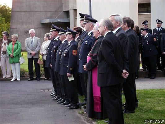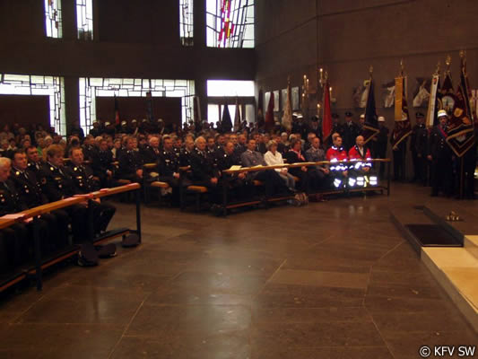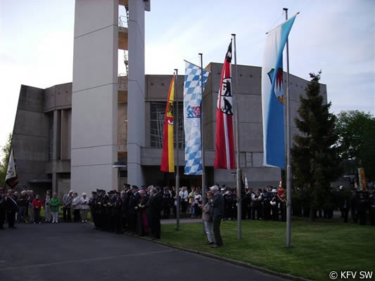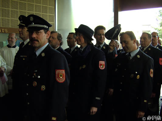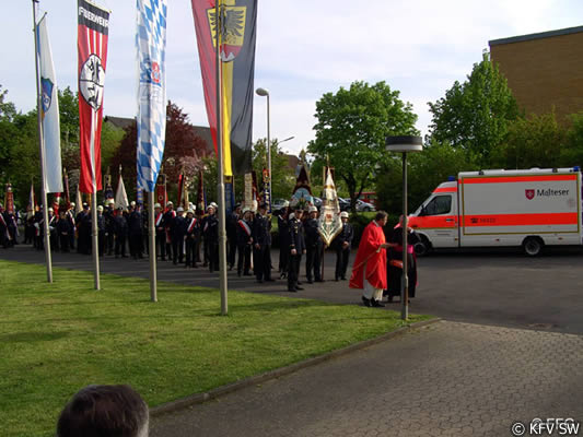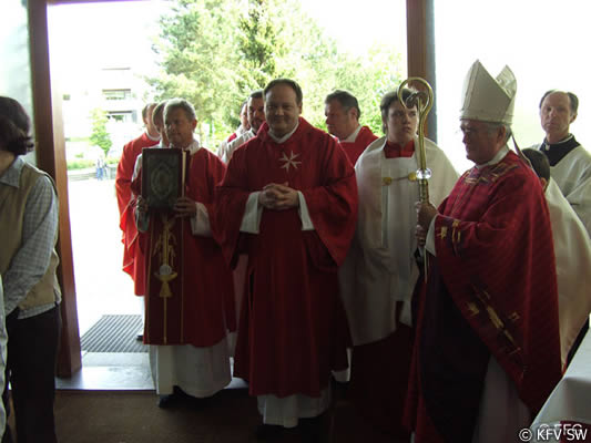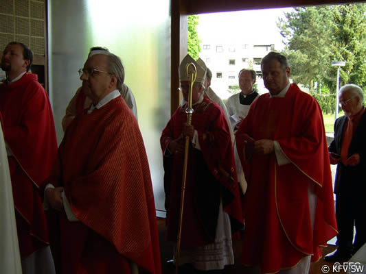 Dieser trifft pünktlich um 17:45 Uhr ein, Kreisfeuerwehrseelsorger Pfarrer Werner Kirchner, stellv. Landrat Paul Heuler und Kreisbrandrat Georg Vollmuth begrüßen ihn. Abordnungen, Feuerwehrleute und Besucher ziehen in die Kirche ein, der Gottesdienst, den fünf Seelsorger und sechs Diakone mit zelebrieren, beginnt.