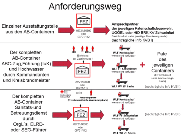 Der Anforderungsweg ist auf nachstehender Übersicht dargestellt. Kommandanten und Kreisbrandmeister können hier über die Feuerwehreinsatzzentrale nach Zustimmung des Kreisbrandrates oder eines Kreisbrandinspektors den AB-Führung (IuK), den AB-Hochwasser und/oder den AB-ABC-Zug anfordern. Von der FEZ aus erfolgt die Alarmierung eines Vertreters des jeweiligen Paten und eines Wechselladerfahrzeuges. Ebenfalls ist die Anforderung einzelner Ausstattungsgegenstände möglich.