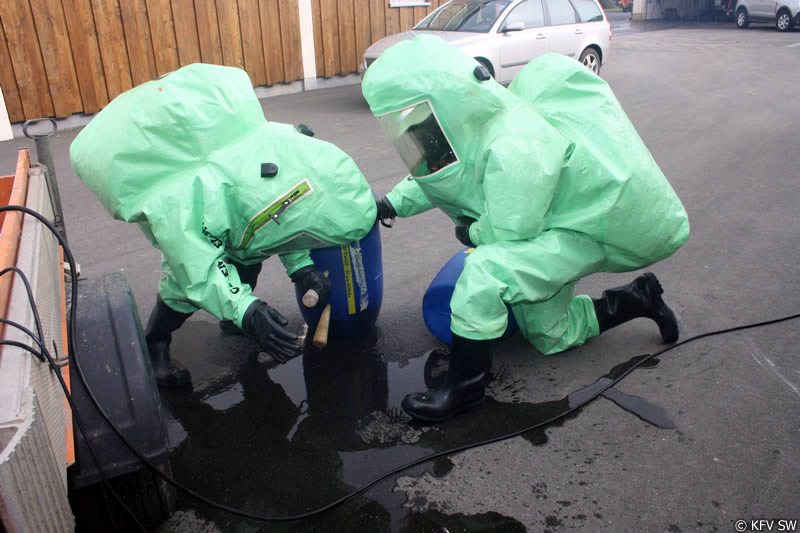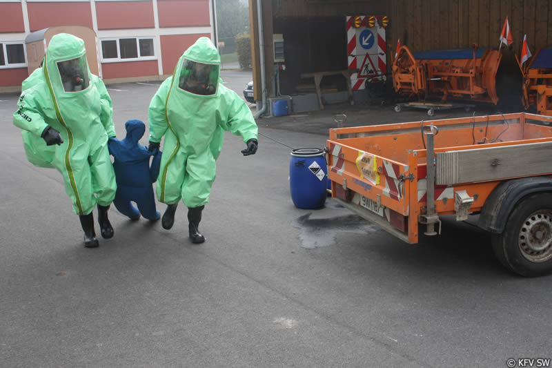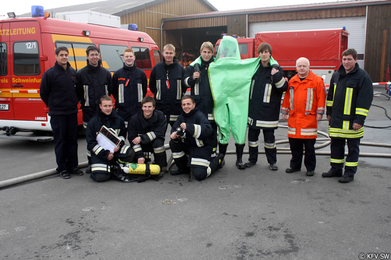 Unter den Augen von Kreisbrandmeister Mirco Böhm sowie Herbert Göb und Stefan Hegler von der Werksfeuerwehr des Kernkraftwerks Grafenrheinfeld legten die Teilnehmer ihre Abschlussübung im Kreisbauhof ab. Gestellt war ein Unfallszenario, bei dem eine Person verletzt im Gefahrenbereich lag, mehrere Fässer einer Säure ausliefen und eine undichte Gasflasche zischte. Die verletzte Person konnte von einem CSA-Trupp schnell aus dem Gefahrenbereich gerettet werden. Im Anschluss wurden die undichten Behälter umgelagert und abgedichtet, so dass eine weitere Schadensausbreitung nicht mehr möglich war.