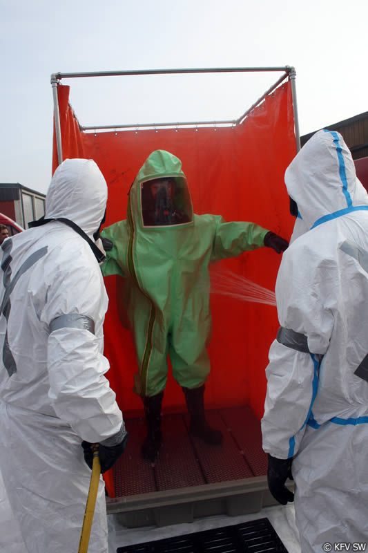 Während der gesamten Einsatzzeit wurde mit Hilfe eines weiteren Trupps unter CSA und einem zusätzlich eingesetzten Trupp unter schwerem Atemschutz die Einsatzstelle abgesichert, um einer unkontrollierten Ausbreitung des Gefahrguts vorzubeugen und um notfalls die eigenen Leute retten zu können. Danach wartete die Dekontaminationsgruppe des AC-Zuges der FF Bergrheinfeld auf die CSA-Träger. Unter der Einmanndusche wurden die CSA-Träger dekontaminiert und anschließend vom Anzug "befreit".