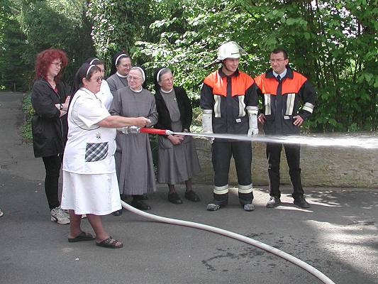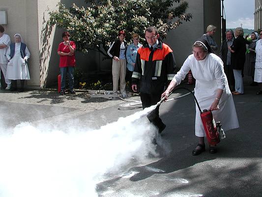 Insgesamt 105 Schwestern, Pflegekräfte und Angestellte des Klosters wurden hierbei unter der Leitung des Heidenfelder Feuerwehrkommandanten Ottmar Weth über Grundlagen des vorbeugenden Brandschutzes und das Verhalten im Brandfall informiert. Zu den Teilnehmern zählten auch einige Schwestern aus dem Kloster "St. Alfons" in Eichelsdorf (Hofheim), welches ebenfalls zur Kongregation der Schwestern des Erlösers gehört.