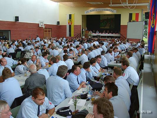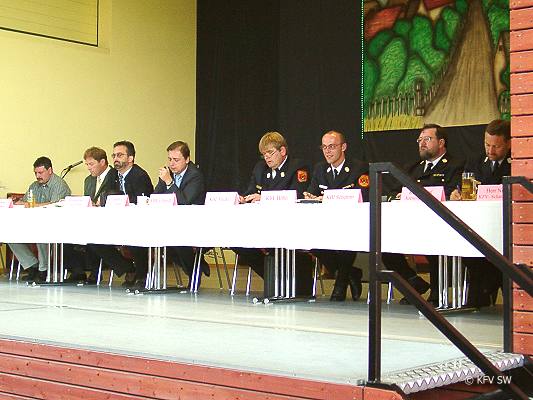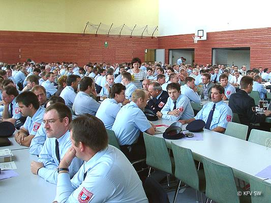 Der ausführliche Leistungsbericht von KBR Vollmuth gab den Anwesenden einen guten Gesamtüberblick über die Tätigkeiten der Feuerwehren im Landkreis Schweinfurt im Jahr 2001, die weit über das Helfen bei Notfällen aller Art hinausreichte. Zwar weist die Einsatzstatistik insgesamt 782 Einsätze aus - darunter 210 Brandbekämpfungen, 462 technische Hilfeleistungen, 66 Sicherheitswachen und 44 Fehlalarmierungen -, bei denen 7506 Feuerwehrdienstleistende 12 922 Stunden tätig waren, aber ein in Zahlenwerten kaum fassbarer weiterer Arbeitsschwerpunkt war die Ausbildung.