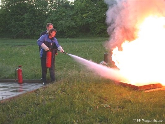 Im zweiten Teil durften die anwesenden Damen (siehe Bild) aktiv mit Feuerlöschern ein "Feuerchen" löschen. Eine Demonstration einer "Fettexplosion" und "Explosionen von Spraydosen" rundeten den Abend ab. Sämtliche Anwesende waren von dem Schulungsabend begeistert, und wir als FFW konnten wieder "Pluspunkte" in der Bevölkerung sammeln.