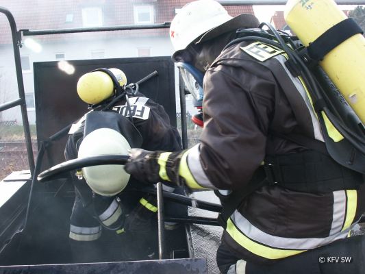 Gerolzhofen - In einer mobilen Brandsimulationsanlage, einem so genannten Brandcontainer, konnten bei der Stützpunktfeuerwehr Gerolzhofen Atemschutzgeräteträger von 15 Wehren aus dem Landkreis Schweinfurt und den benachbarten Landkreisen Haßfurt, Kitzingen und Bamberg unter realistischen Bedingungen die Brandbekämpfung in geschlossenen Räumen üben.