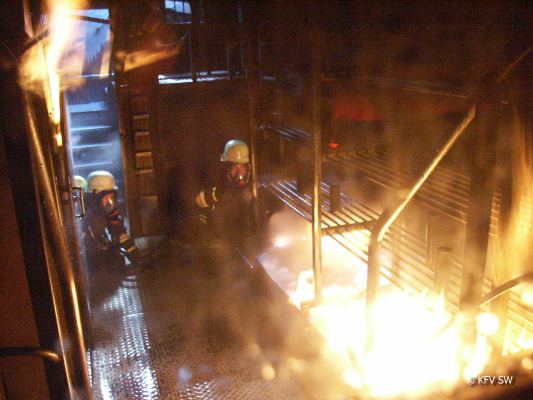 Die Anlage, die jüngst in Gerolzhofen für drei Tage Station machte, gehört der Firma National Fire Training Systems (NFTS) mit Sitz in Teltow bei Berlin. Der Jumbo-Auflieger, der in Gerolzhofen zum Einsatz kam, misst 13,50 Meter in der Länge und der Container hat einen Rauminhalt von 100 Kubikmetern. Im Innern sind in variabler Gestaltung die Simulation von Keller-, Werkstatt- und Zimmerbränden möglich. Auch ein brennender Schalterkasten sowie eine in Flammen zu setzende Industrie-Gasanlage gehören mit zur Ausstattung. Somit können beinahe alle Brandsituationen simuliert werden, mit denen sich die Einsatzkräfte auch in der Realität konfrontiert sehen. In jedem Raum befinden sich mehrere Brandstellen, die mit Propangas umweltschonend befeuert werden. Der Atemschutztrupp betritt die mehrere Hundert Grad heißen und vernebelten Räume der Anlage vom Dach her, um gleichzeitig den Abstieg in einen brennenden Keller zu üben. Bei 475 Grad Celsius schaltet die Anlage automatisch ab. Allerdings können bei künstlich ausgelösten Rauchgasrückzündungen, den im Ernstfall für die Retter extrem gefährlichen Flash-Over, kurzzeitig Temperaturen von bis zu 800 Grad Celsius erreicht werden. Im Vergleich dazu: Pizzas backen im heimischen Backofen bei gut 200 Grad.