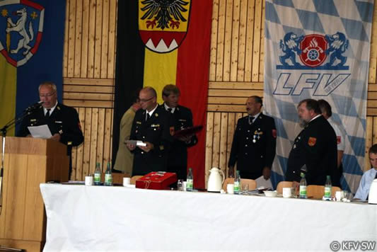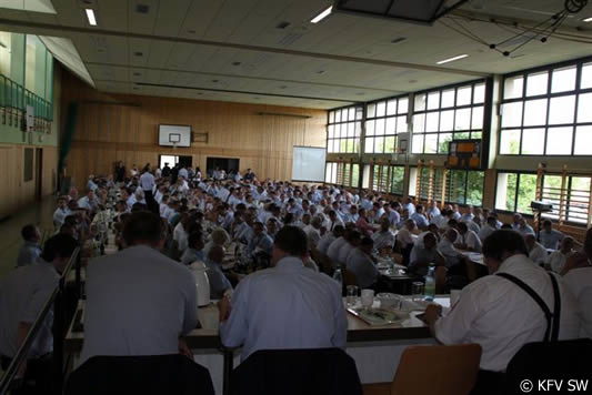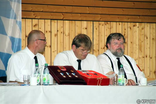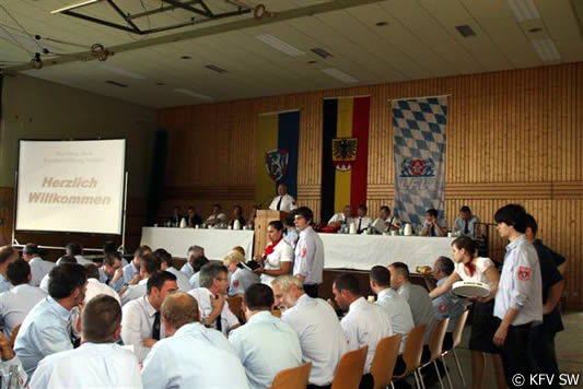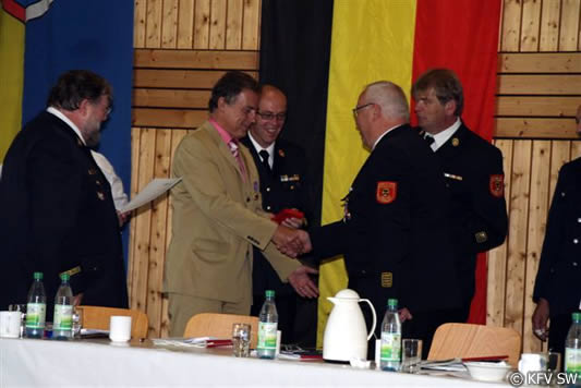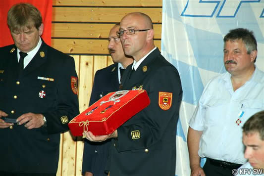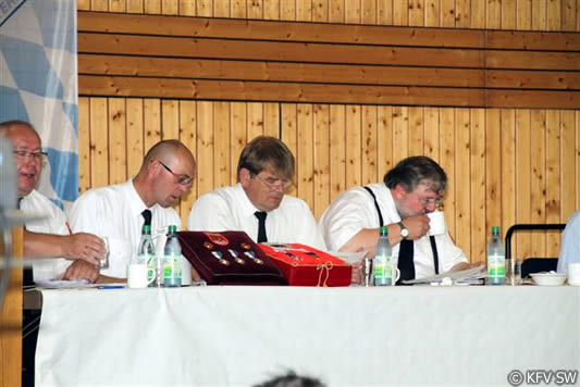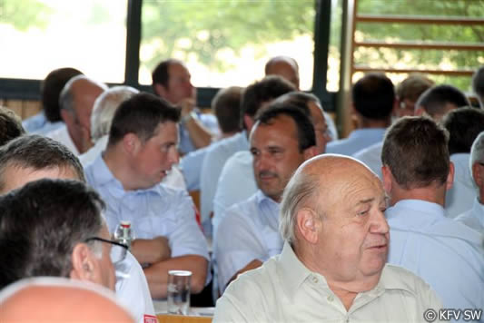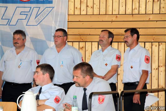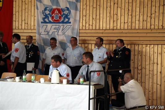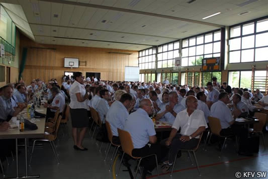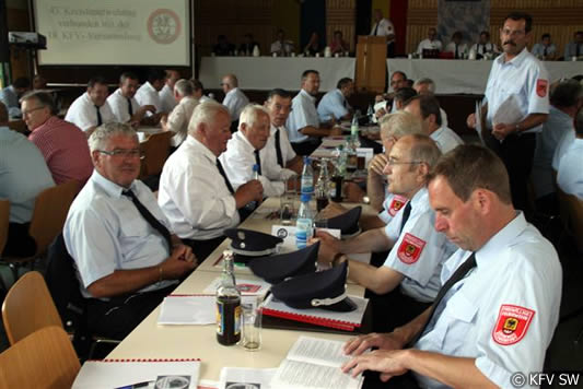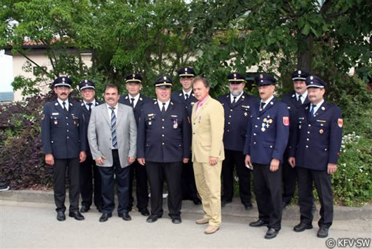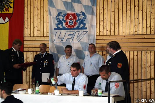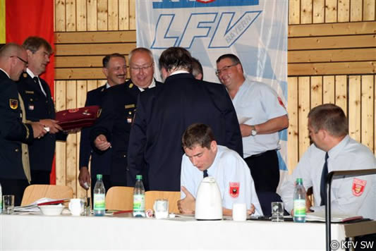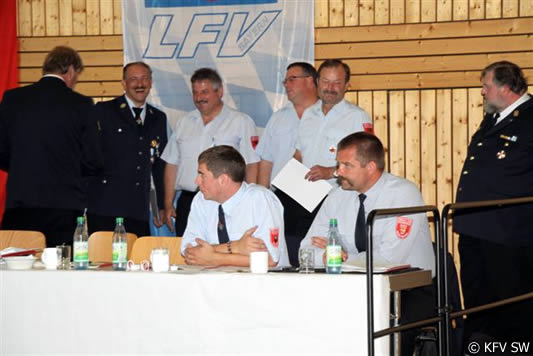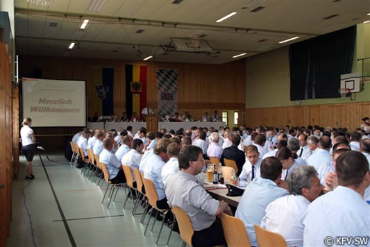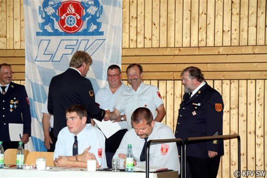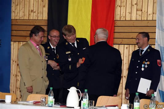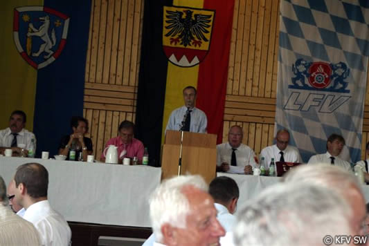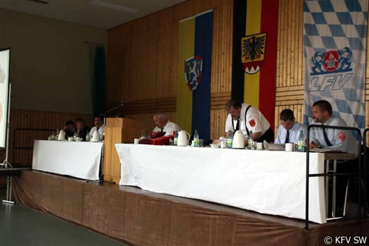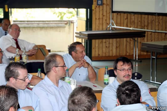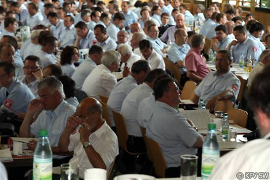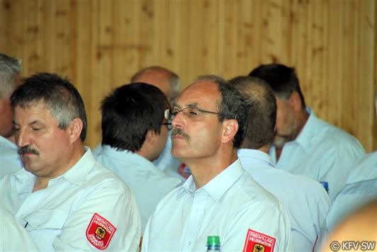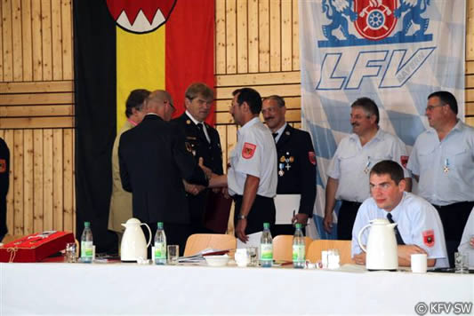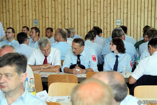 In den sonstigen Fachvorträgen ging es um den Jahresrückblick 2009, Alarmierungspläne in der Integrierten Rettungsleitstelle Schweinfurt, den Brand einer Kindertagesstätte 2006 in Landshut oder rechtliche Probleme bei Feuerwehr-Homepages. Am Nachmittag startete dann, bei glühender Hitze der Festumzug, im Rahmen der 125 Jahr-Feier der Feuerwehr Wasserlosen: kilometerlang von der Kirche zum Festplatz: Kommandant Josef Schießer begrüßte rund vierzig Vereinsabordnungen, von freiwilligen Feuerwehren aus dem Landkreis und Region ebenso wie der Musikkapelle und sonstigen Ortsvereine: Die Patenfeuerwehren aus Wasserlos (Alzenau) und Bad Friedrichshall (Baden-Württemberg) durften beim Festbetrieb ebenfalls nicht fehlen.