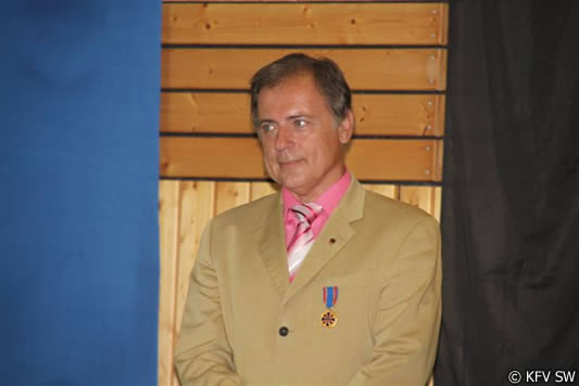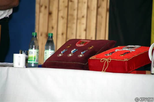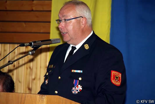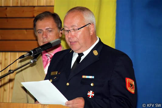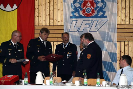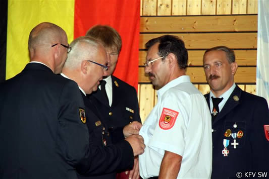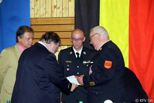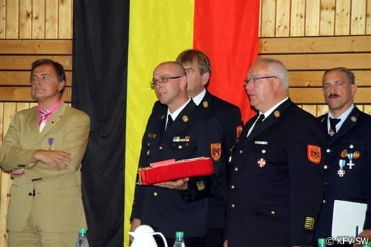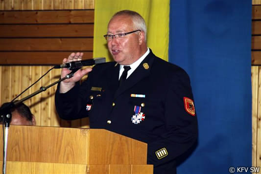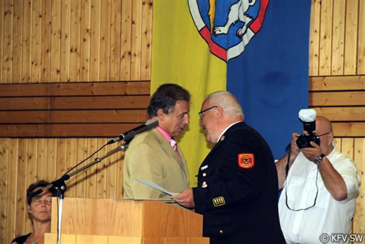 WASSERLOSEN – „Ich werde noch zum Sowjetmarschall“, scherzte Landrat Harald Leitherer, ob eines weiteren hohen Ehrenzeichens an der Brust: Vom Deutschen Feuerwehrverband gab es den Verdienstorden, für langjährige herausragende Unterstützung der Ortsfeuerwehren auf Kreisebene: durch Schaffung von Atemschutzwerkstatt und Ausbildungszentrum in Niederwerrn ebenso wie die Bereitstellung von Fahrzeugen oder Brandübungs-Containern. Leitherer durfte sich über die höchste Auszeichnung freuen, die Deutschlands Floriansjünger an „Zivilisten“ verleihen. Ebenfalls auf dem 43. Kreisfeuerwehrtag in Wasserlosen ausgezeichnet wurde Mitstreiter Georg Vollmuth – dieser erhielt als Kreisbrandrat das Verdienstkreuz des DFV in Silber, nicht zuletzt für seine hervorragende Jugendarbeit.