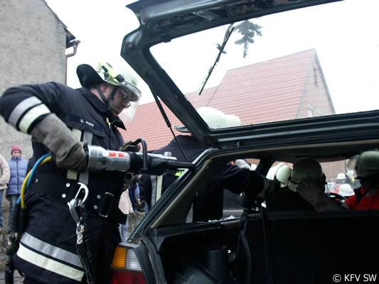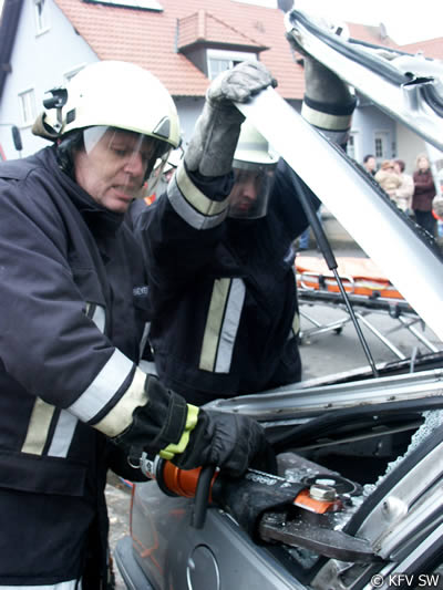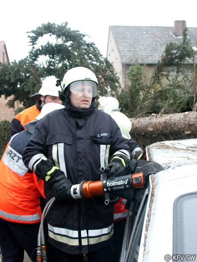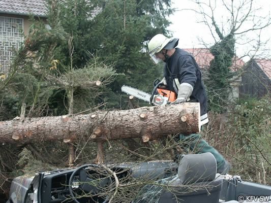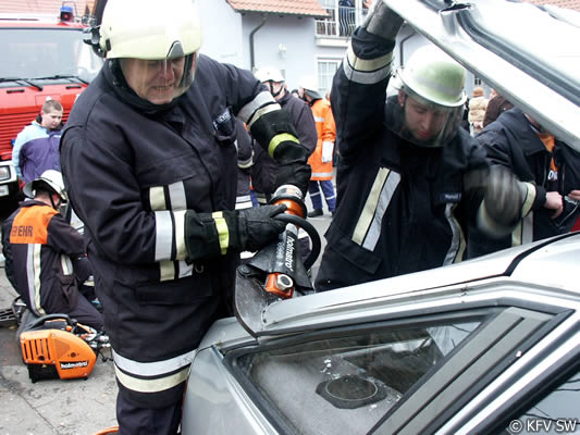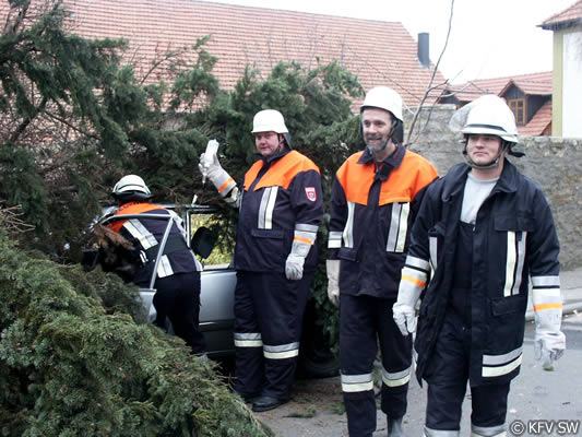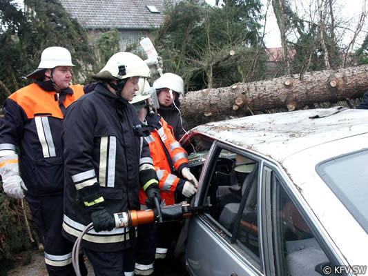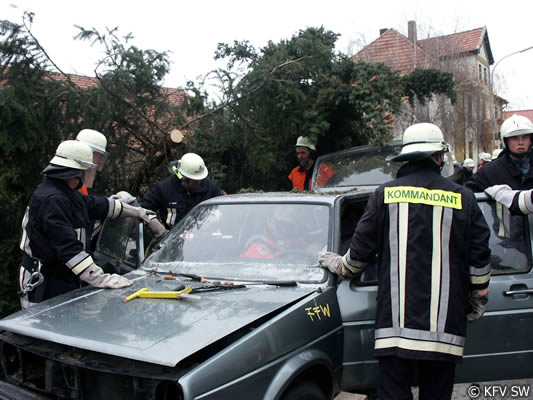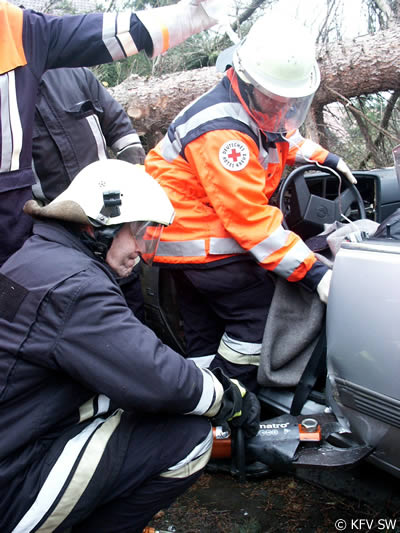 Um an die Verletzten, von denen drei in Pkw eingeklemmt waren, zu befreien, mussten von der Feuerwehr teilweise die umgestürzten Bäume zersägt werden. Um zu verhindern, dass die schräg aufliegenden Stämme einseitig belastet wurden und dann abrutschten und dadurch zu einer zusätzlichen Gefahr für die Eingeklemmten wird, mussten die Bäume zunächst abgestützt und gegen Wegrutschen gesichert werden. Mit hydraulischem Rettungsgerät entfernten die Einsatzkräfte dann bei drei Pkw Türen, das Dach und mehrere Holme, um dem medizinischen Personal einen besseren Zugang zu den Verletzten zu ermöglichen. Dadurch kann bei komplizierten Verletzungsbildern verhindert werden, dass zusätzliche Nachfolgeschäden entstehen. An den Arbeiten mit den Rettungssätzen waren die Wehren aus Stammheim, Unterspiesheim und Gerolzhofen beteiligt.