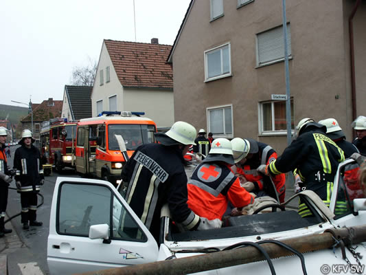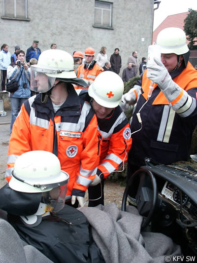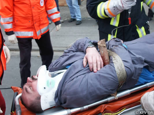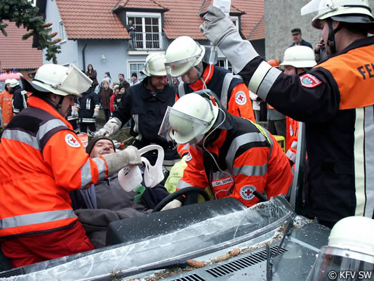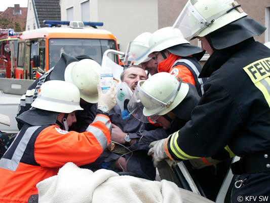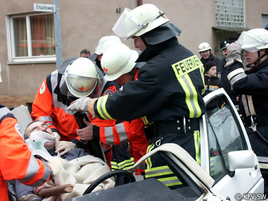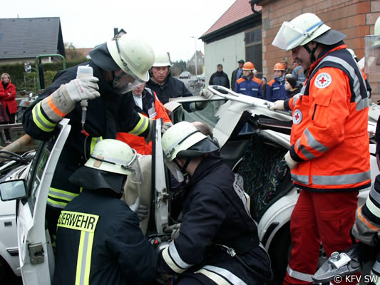 Notarzt Dr. Reinhard Skaar zeigte sich nach der Übung positiv beeindruckt von der guten Zusammenarbeit zwischen Feuerwehr und den Hilfskräften, die Hand in Hand arbeiteten. Hier macht es sich bemerkbar, dass Feuerwehr und BRK zumeist gemeinsam die Übungen bestreiten und damit die Abläufe automatisiert werden.