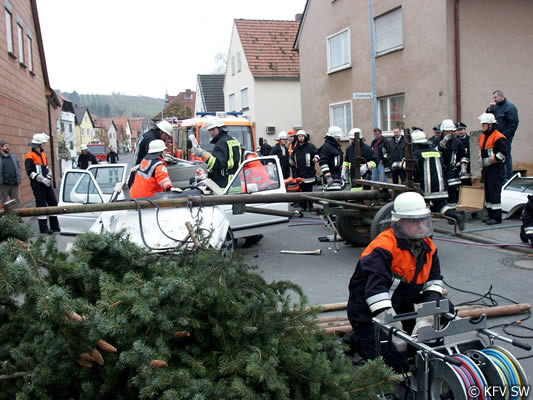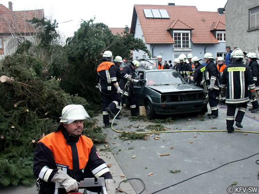 Die Stammheimer Feuerwehr hatte eigens hierfür mit viel Phantasie ein besonderes Szenario ausgearbeitet. So wurden in der Hauptstraße zwei Fahrzeuge unter einem vom Sturm geknickten Baum begraben und zusätzlich ein Unfall inszeniert, in den ein Traktor mit Auflieger und ein PKW verwickelt waren. Hierzu wurde die Ortsdurchfahrt in Stammheim für zwei Stunden gesperrt.