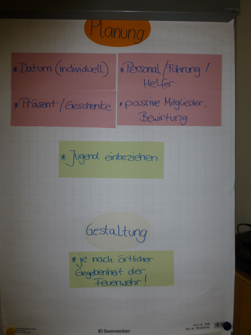 Der Nachmittag gehörte Workshops. Dazu bekamen die Jugendwarte in vier Gruppen unterschiedliche Arbeitsaufträge. Die ersten sollten einen Kennenlern- beziehungsweise Anwerbetag einer Jugendfeuerwehr im Allgemeinen planen und den Ablauf festlegen. Eine andere Gruppe sollte ein Jahreskonzept inklusive Planung erarbeiten, um einen Überblick über Ausbildungs- und Aktionsmöglichkeiten zu bekommen.